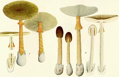Technical description (t.b.d.) BRIEF DESCRIPTION: The following is based on the original description by Boedijn (1951) from Javan material. The cap of Amanita similis is 50 - 120 mm wide, convex at first, then plano-convex, smooth, grayish brown in the center, between isabelline and light brownish olive, gradually changing to honey yellow to chamois near the margin, with a sulcate-striate margin (nearly 50% of the radius). The volva is absent but sometimes present as a single, white, membranous patch. The flesh is rather thin, dirty white, up to 5 mm thick over the stem, rapidly thinning to a membrane over most of the length of the marginal striations. The gills are free, pale or naphthalene yellow in side view, mustard yellow to amber yellow in mass, up to 14 mm broad. The stem is 100 - 150 × 8 - 16 mm, hollow, fibrillose, narrowing upward, grayish yellow near the top, mustard yellow near the base, with the colors somewhat dingy above, brighter towards the base. The ring is grayish, 20 - 35 mm from the top of the stem, membranous, skirt-like, and falling against the stem. The saccate volva is attached only near the base of the stem, grayish on the outer surface, and 20 - 35 mm wide. The flesh is 2 - 3 mm thick. The spores measure (9.5-) 10 - 12 (-14) × (6.5-) 7 - 8 (-9) µm. Spore measurements not including extremes of length and width were called the "most common dimensions" by Boedijn. This species was originally described from Java. The following is based on Corner and Bas ( The cap of Amanita similis is 60 - 130 mm wide, cylindric-bell shaped at first, becoming plane to slightly concave and subumbonate, viscidat first when moist, dark bistre to dark brownish olivaceous or olivaceous-umber in the center, with the outer striate part varying from wine-pink to reddish orange to pale orange or yellowish, entirely olivaceous-umber in age, with a sulcate-striate margin (30 - 50% of the radius). The cap gives the appearance of having innate radial fibers or streaks. Volval remains are absent. The flesh is soft, 4 - 8 mm thick above the stem, pale yellowish to yellowish white, deeper yellow below the cap skin. The gills are free, crowded, 5 - 10 mm broad, pale yellow or yellowish white in side view, with a deep yellow, orange or pinkish orange floccose edge. The short gills are truncate, obliquely truncate, or sometimes attenuate, plentiful, and unevenly distributed. The stem is 100 - 180 × 6.5 - 15 mm, narrowing upward, hollow, canary yellow to pale yellow orange or pale yellow, marked with orange to pinkish orange or concolorous floccose-fibrillose concentric zones below the ring and above the volva, striate and fibrillose above the ring. The ring is skirt-like, 20 - 35 mm from the top of the stem, thin, membranous, extending 12 - 17 mm from the stem, pinkish orange to pale orange to orange-yellow, slightly striate above, more yellowish and subfloccose on the underside, and rapidly collapsing. The saccate volva is 25 - 50 × 10 - 30 mm, white, sometimes with dingy brownish stains, rather thick, firm, with an irregularly lobed edge, attached only at the very base of the stem, with an indistinct internal limb placed a few millimeters above the point of attachment to the stem. The spores measure 7.0 - 9.9 × (5.4-) 6.1 - 8.6 µm from dried material and 8 - 11 × 7 - 9 µm (or smaller) from fresh material and are broadly ellipsoid to ellipsoid, occasionally subglobose and inamyloid. Clamps are present at bases of basidia. The following is based on the description by Hongo (1975) from Japanese material. The cap of Amanita similis is 80 - 90 mm wide, convex then expanded and somewhat umbonate, viscid at first, innately streaked, bronze to honey yellow, darkest in the center, with a sulcate-striate margin (30 - 50% of the radius). The flesh is pale yellow, bright yellow underneath the cap skin especially under the umbo. The gills are free, close, pastel yellow, 6 - 7 mm broad, with a gray-brown floccose- crenulate edge, with decurrent lines at the top of the stem. The short gills are obliquely truncate. The stem is 110 - 130 × 10 - 13 mm, slightly tapering upward, stuffed, maize yellow to butter yellow, with dingy yellow incomplete concentric zones from the underside of the ring to the top of the volval limb. The ring is superior, brownish yellow, membranous, striate on the upper surface. The volva is white, thick in the lower part, thinning out toward the margin. The spores measure 7.5 - 10.5 × 5.5 - 7.5 µm are are broadly ellipsoid and inamyloid. The Japanese material is associated with pine and oak. Hongo's watercolor of this species (Imazeki & Hongo 1987 (plate 29)) shows a distinctly brownish tint to the stem and to the squamules that decorate it. As a consequence, there are no bright colors on it. The ring has collapsed on the stem and is distinctly browner than the brownest yellow of the stem, more like a yellowish light brown. General comments follow: The three descriptions differ primarily in the color of the stem and its decoration, the color of the ring on the stem, the color in the area of the cap striations and just at its margin. Unfortunately we are not able to fully interpret the available information on spore size and shape. Boedijn presents five spore drawings with a length/width ratio ranging from approximately 1.4 - 1.6. Hongo presents two drawings in approximately lateral view with a length/width ratio ranging from approximately 1.4 - 1.55. In both cases, estimation of the average ratio based on the printed spore measurement is consistent with the ratios computed from the spore drawings -- 1.45 in the first case, 1.4 in the second case. The same ratio computed from the drawing of five spores from Corner and Bas yields a range of 1.15 - 1.4. Estimates of the average ratio from each of the three sets of spore measurements that they give range from 1.15 - 1.25. It would appear from this evidence that the spores of the Singapore material are proportionately broader than the
