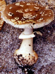 Technical description (t.b.d.) BRIEF DESCRIPTION: The fruiting bodies of A. sinocitrina are small to medium-sized. The cap is 40-60 mm wide, convex to applanate, gray-yellow, sometimes brownish, with indistinct, innate, radial fibrils. It is covered with grey to brownish, verrucose to floccose, felty, volval patches; its flesh is white, but turns brownish when exposed, especially in the bulb. The gills of this species are free to subfree, crowded, white to cream-colored; and the short gills are attenuate and of diverse lengths The stipe is 60 - 90 x 5 - 10 mm, subcylindric to attenuate upwards; its surface is white to dirty white, covered with yellowish to yellow squamules above the annulus, and with whitish to grayish squamules or fibrils below the annulus; the stipe's basal bulb is 15 - 25 mm wide, subabrupt to abrupt, marginate, with the upper margin covered with grayish to brownish, verrucose to floccose volval remnants.. The annulus is membranous and superior to nearly medium, with its upper surface cream-colored to yellowish and lower surface whitish to grayish or brownish. Spores of A. sinocitrina measure (5.5) 6.0 - 7.5 (8.0) x (5.0) 5.5 - 7.0 (7.5) µm and are globose to subglobose, and amyloid. Clamps are not present on the bases of basidia. Amanita sinocitrina was originally described from central China. It occurs in mixed forests with broad-leaved trees and conifers. Its distribution range is still unknown. Amanita sinocitrina is characterised by its small to medium-sized basidiocarp with a gray-yellow pileus, grey to brownish volval remnants, a whitish to yellowish annulus, a subabrupt to abrupt, marginate bulb on the base of the stipe, and small basidia and spores. It is related to taxa such as A. bulbosa var. citrina (Schaeff.) Gillet [=A. citrina (Schaeff.) Pers. non Gunnerus] and A. bulbosa var. bulbosa (Schaeff.) Lam. [=A. citrina var. alba (Quél.) E.-J. Gilbert]. However, A. sinocitrina differs from the European A. citrina by its differently colored pileus with somewhat darker colored volval remnants, smaller basidia and significantly smaller spores. Amanita sinocitrina is also similar to A. citrina var. grisea (Hongo) Hongo, A. citrina f. lavendula (Coker) Veselý, A. brunnescens G. F. Atk. var. brunnescens (=A. brunnescens var. pallida L. Krieg.), A. brunnescens f. straminea E.-J. Gilbert (=A. citrina sensu auct. amer. orient.), A. aestivalis Singer ex Singer and A. asteropus Sabo ex Romagn. However, A. citrina var. grisea, described from Japan, has a darker colored pileus, pallid yellow annulus, larger basidia and larger spores. Amanita citrina f. lavendula, originally described from the U.S., is distinguished from A. sinocitrina by, among others features, its differently colored pileus with lavender staining fruiting body and somewhat smaller spores. Amanita brunnescens from eastern North America usually has larger basidiocarps with umbrinous brown, innate radial striations or fibrils on the pileus covered with whitish to pallid volval remnants, a white stipe with a usually longitudinally cleft bulb, longer basidia, and larger spores. Amanita brunnescens f. straminea has a differently colored pileus and stipe, and larger spores. Amanita brunnescens var. pallida and A. aestivalis, both described from eastern North America, have a paler colored pileus, a longitudinally splitting bulb, larger basidia and larger spores. Amanita asteropus, described from Europe, has a differently colored pileus with differently colored volval remnants, and without innate, radial fibrils, a longitudinally splitting bulb, trama or surface of stipe turning rapidly brown-orange when injured, and larger spores. -- Zhu L. Yang Photo: Zhu L. Yang (Hunan Province, China). [ Section Validae page. ] [ Amanita Studies home. ] [ Keys & Checklist/Picturebooks ] Last changed 24 January 2009. |