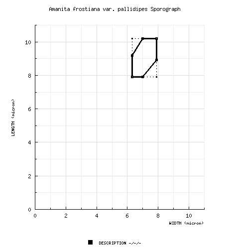 Jenkins (1978a): "There were no specimens originally cited, requiring designation of a neotype. The collection chosen is mixed, but includes fruit bodies exhibiting the characters of the original description. the two taxa can be separated on amyloidity of spores, those of the type fruit bodies of Amanita frostiana var. pallida exhibiting a negative reaction, the others reacting positively. Fruit bodies have been annotated appropriately." Because of the rarity of clamps on the basidia and the form of the universal veil on the stipe's bulb, it is clear that that the present taxon cannot be a variety of A. frostiana, a muscarioid taxon. We provisionally place the present taxon in subsection Pantherinae. In this subsection, it is very unusual for a small-capped specimen to lack distinct striations on the pileus. If this part of the descripion of the present taxon is in error, then the present taxon seems very comparable to A. multisquamosa. A comparison of the sporographs of the two taxa is presented in the following figure: At present, we don't see a good reason to return this name to common use and consider it a poorly known, possible synonym of A. multisquamosa. | ||||||||