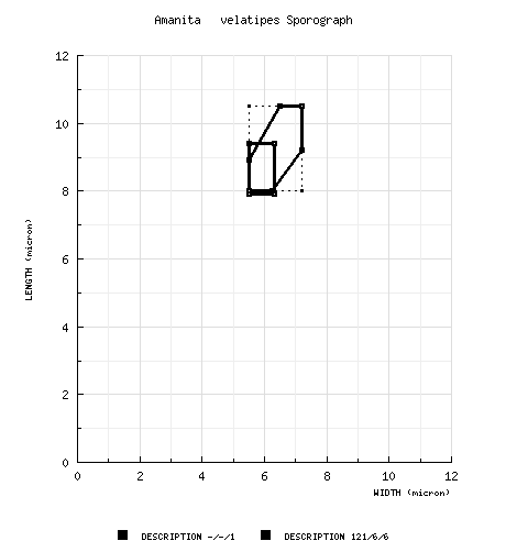 sterile. In evaluating the collection in RET's herbarium as a group, a set of collections from Cumberland Co., Maine, U.S.A. stood out because of their unusually broad spores. These differed so greatly from the spores of the other material reviewed that we have segregated them for the moment—data from these collections is not included in the description above. The set of segregated collections is as follows: MAINE—Cumberland Co. - Cumberland Center, 22.vii.1984 S. S. Ristich 7-22-84-SSRA (RET 113-7); Cumberland Center, Rte. 9, 25.vii.1984 S. S. Ristich 7-25-84-SSRA (RET 207-1), 28.vii.1984 S. S. Ristich 7-28-84-SSRA (RET 207-2); North Yarmouth, 5.viii.1990 S. S. Ristich s.n. [Tulloss 8-5-90-SSR1] (RET 477-5). Spore data for the excluded collections is as follows: [67/3/3] (8.1-) 8.5 - 10.5 (-12.1) × (6.3-) 6.6 - 8.2 (-10.5) μm, (L = 9.1 - 9.6 μm; L' = 9.4 μm; W - 7.1 - 7.7 μm; W' = 7.3 μm; Q = (1.10-) 1.13 - 1.46 (-1.51); Q = 1.19 - 1.34; Q' = 1.30). We note that spore length hardly differs on average from spore length seen in the material determined with greater confidence to be A. velatipes. The sample size is small in both groupings. Also, neither group has been thoroughly evaluated anatomically. A comparison of the spores of the present species with those of A. multisquamosa and A. subvelatipes will be pesented in the following diagram: | ||||||||