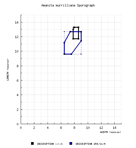 Sometimes, individual specimens of A. spreta can be very pale to white. A sporograph comparison of the present taxon to A. spreta is provided below. The spores of A. spreta can be seen to be, in general, more elongate. Amanita spreta is also a more robust species with a more fleshy cap that, consequently, has shorter marginal striations. There is some reason to consider whether A. calyptrata var. albescens (a poorly known taxon originally described from Saratoga Co., New York, U. S. A.) could be a synonym of the present species. RET has not seen the type of the latter, but a broef type study was published by Jenkins (1979). A sporograph comparison of the present entity with Jenkins' spore measurements from Peck's A. calyptrata var. albescens is provided below: Specimens of the present species have been previously been provided with temporary code names including Amanita sp-QUE01, A. sp. S5, and A. sp-T41. Need to check nrLSU sequences when they become available in GenBank because of this old note: A preliminary molecular study (unpublished) of the specimen on which Amanita sp-QUE01 is based shows that the specimen is phylogenetically closest to A. murrilliana in a sample of nearly 60 taxa of sect. Caesareae; however, due to the known morphological difference (spore width) and some phylogenetic differences (ca. 8 bp limited to ITS1 or 1.52% of the single nrITS sequence obtained), RET hesitates to place the present collection in A. murrilliana at present. | ||||||||||||||||||||||||||||||||||||||||||||||||||||||||||||